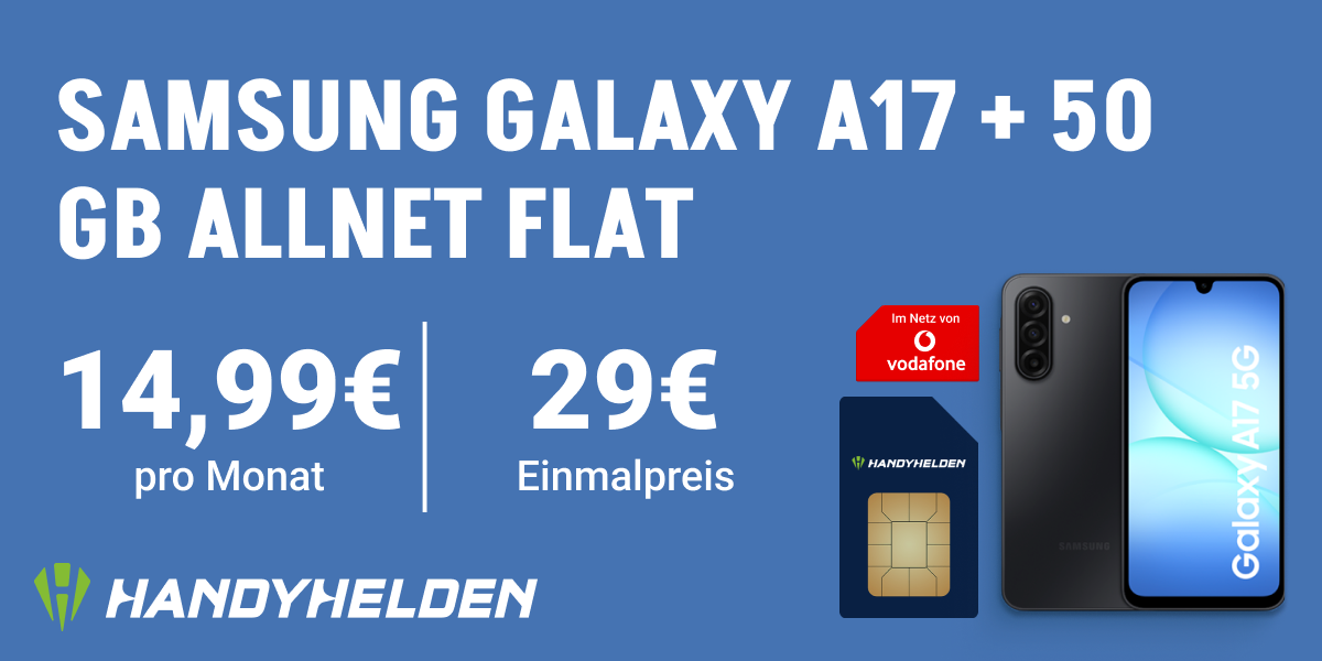 - Samsung Galaxy A17 (128 GB) + freenet Allnet-Flat 50 GB (Vodafone-Netz) mit 50 GB 5G für 29,00 € + 14,99 € Grundgebühr