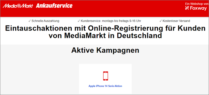 Durchgeführt wird die Bewertung und der Ankauf der Altgeräte von Foxway. Du kannst aber auch beim MediaMarkt vor Ort Dein Altgerät eintauschen: