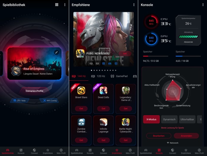 Interessant ist aber auch der Punkt Empfehlungen in der Armoury-Crate-App. Hier werden (aktuelle) Spiele-Empfehlungen angezeigt, die sich nach unterstützte Bildwiederholraten, Gamepad-Support – es gibt mit dem ASUS ROG Kunai 3 ein passendes Gamepad separat zu kaufen – oder auch Empfehlungen der ROG-Community unterteilen. Kurzum, ASUS nimmt das Wort „Gaming-Smartphone“ mit dem ASUS ROG Phone nicht nur in puncto Hardware ernst.