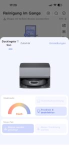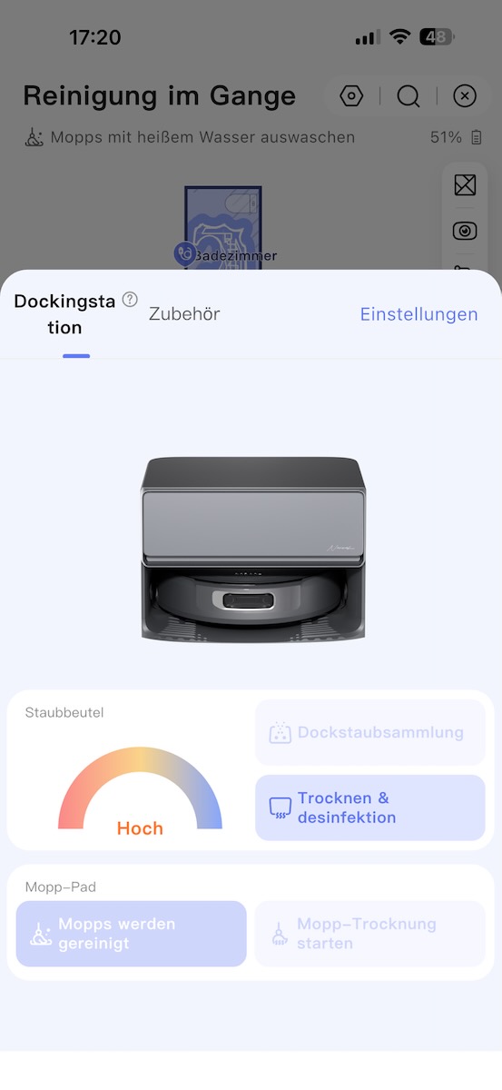 Ganz schlimm getriggert fühlten wir uns auch von der Übersicht zu den Verbrauchsmaterialien wie Wischtuch, Staubbeutel und Co. Der begegnet man in den Einstellungen nämlich mit einer klaffenden Lücke: „Verbrauchs materialien“. Es wäre auch schön, wenn man beim Modell mit direktem Leitungsanschluss mehr Informationen zum Leitungssystem in der App sehen würde, doch die einzige Statuskachel versteckt sich im Menü der Dockingstation unter Zubehör. In den Einstellungen zur Dockingstation gibt es tatsächlich auch den Punkt „Entleerung der Basis“, aber leider keinen manuellen Test-Run, der einfach mal Wasser hinein- und hinauspumpt. Alles sehr versteckt, dafür, dass der Direktanschluss der kompakten Basis DAS Feature schlechthin ist.