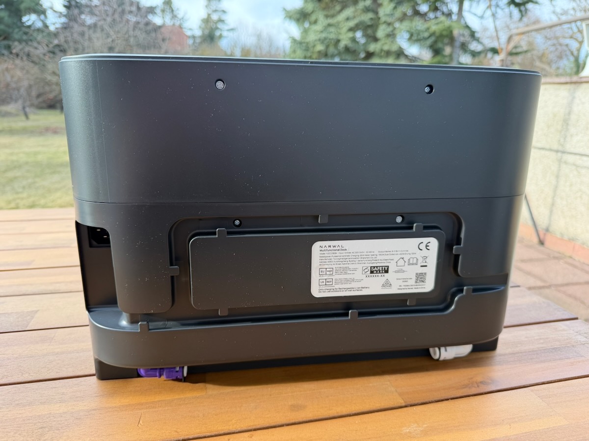 Kommt wieder ohne Turmaufbau: Narwal Flow 2 Lidar sitzt an der Rückseite; darunter: Ladekontakte und Wasserverbindungen (Foto: Michael Spieler / Handyhase)