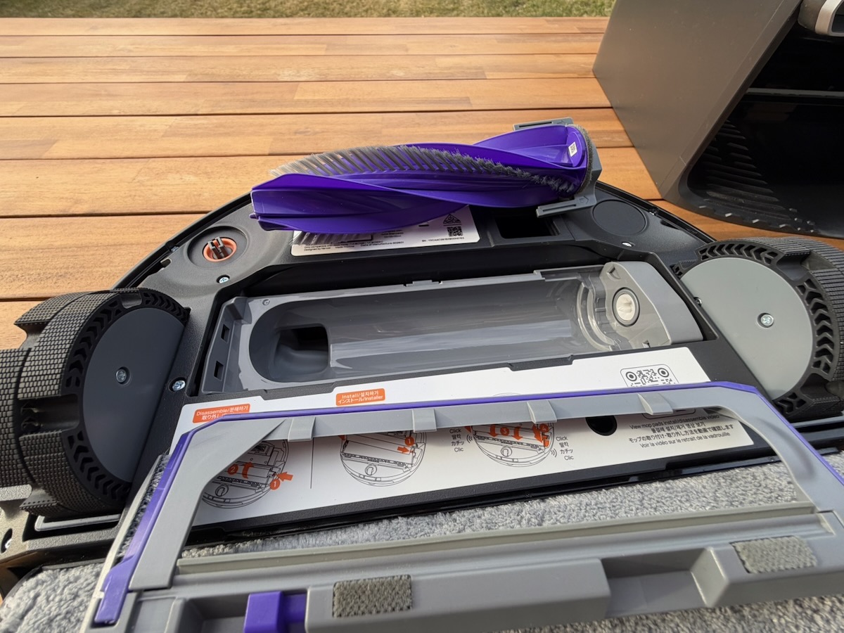 Aus uns unbekannten Gründen wurde die linke Seitenbürste eingespart. Vermutlich sitzt die zweite Saugöffnung ihr so nah, dass die Seitenbürste mit der gesteigerten Saugkraft überflüssig wurde, oder ihre langen Borsten wurden immer selbst hineingesaugt und dadurch stark eingeschränkt bzw. unbrauchbar. Beim Überfahren von Teppichen wird die ganze Einheit um die Bürste herum abgesenkt und an den jeweiligen Teppich angepasst, in den Flor gedrückt. Das konnte der Vorgänger aber auch schon. Der Staub landet im Staubbehälter, der mit einem HEPA-Filter den Luftstrom reinigt. Beides sollte nach ca. 90 Stunden ersetzt oder gereinigt werden.