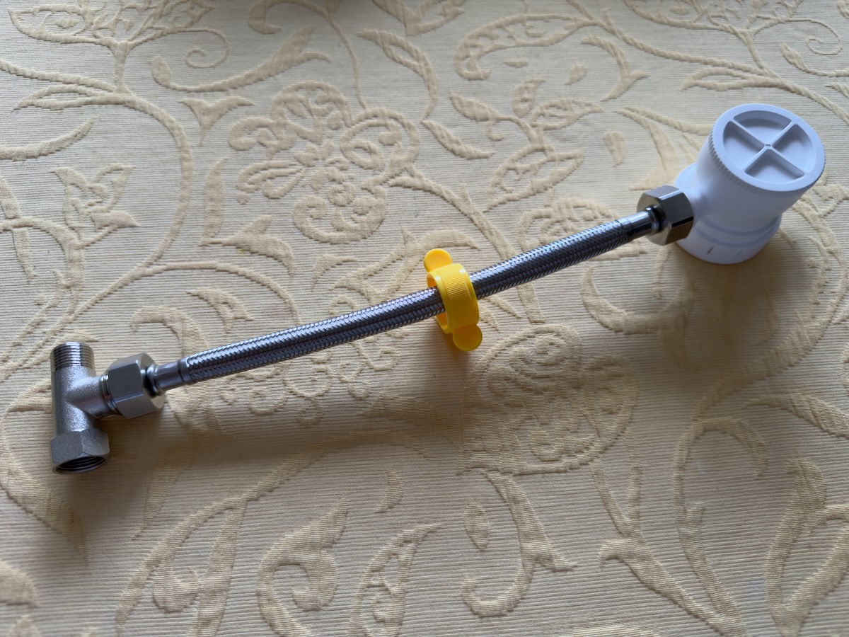 Beim Frischwasseranschluss stehen wir genau vor der gleichen Herausforderung wie in der Küche: Ein anderes T-Stück muss her. Das beiliegende T-Stück könnte man so nur VOR dem Eckventil montieren, was ein Abstellen des Haupthahns erfordern würde. Das wäre alles ziemlich aufwändig und wenig hilfreich. Es gibt allerdings T‑Stücke, die ⅜ Zoll durchlassen und den Abzweig zu ½ Zoll haben. So einen haben wir uns bestellt. Dazu gleich noch ein Rückschlagventil, das wir zwischen T-Stück und Panzerschlauch von Narwal setzen.