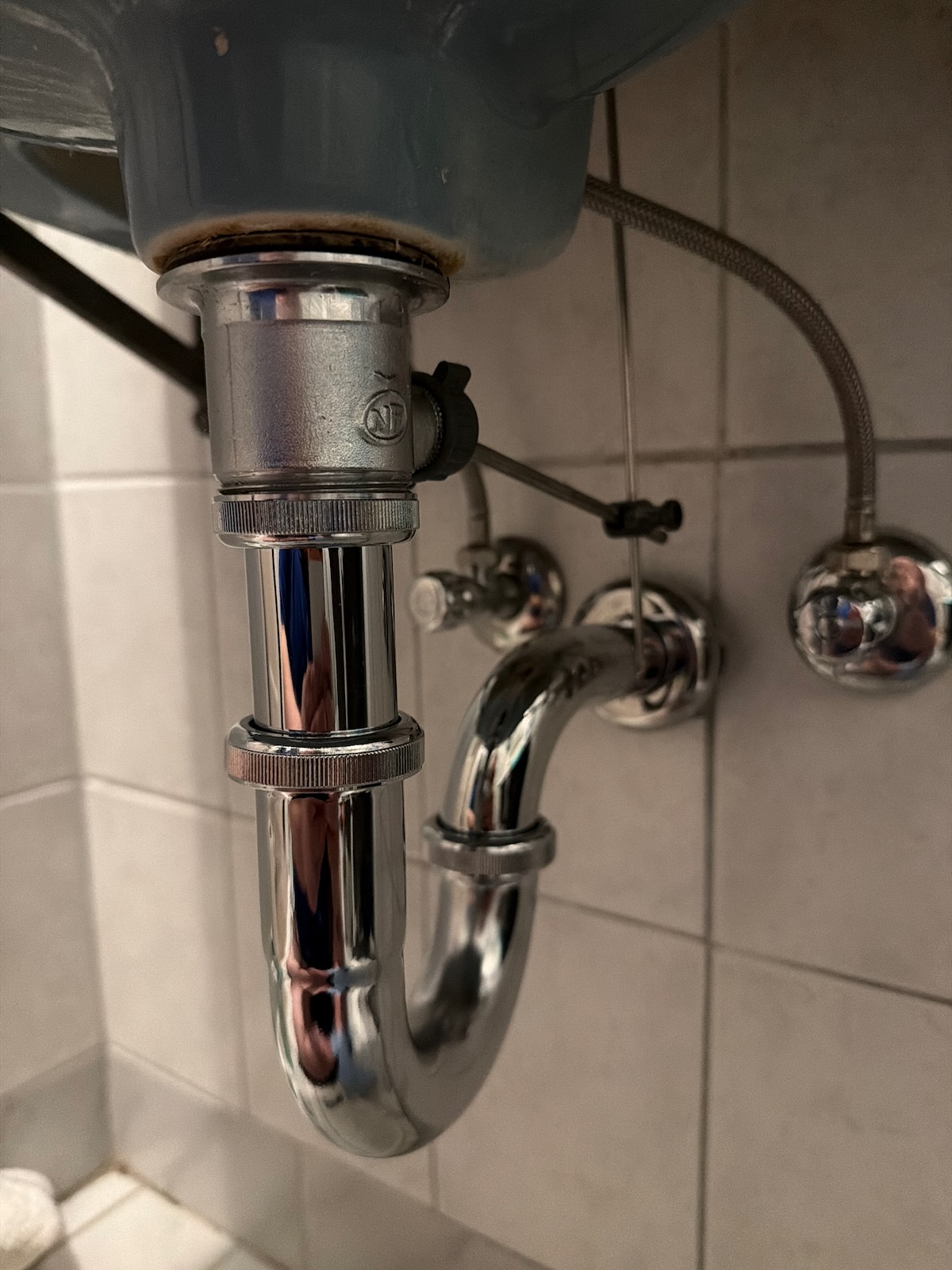 Wenn Dein Waschbecken auf einem Waschtisch steht und Dein Abfluss aus Kunststoffrohren besteht, ist das evtl. genauso einfach zu handhaben wie in unserem Küchenbeispiel. Bei uns sieht man den Abfluss, daher Chrom (gibts modern auch in Schwarz und ohne sichtbare Schleife).