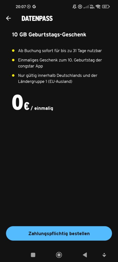 Buchung des kostenlosen Datenpasses von Congstar – Screenshot