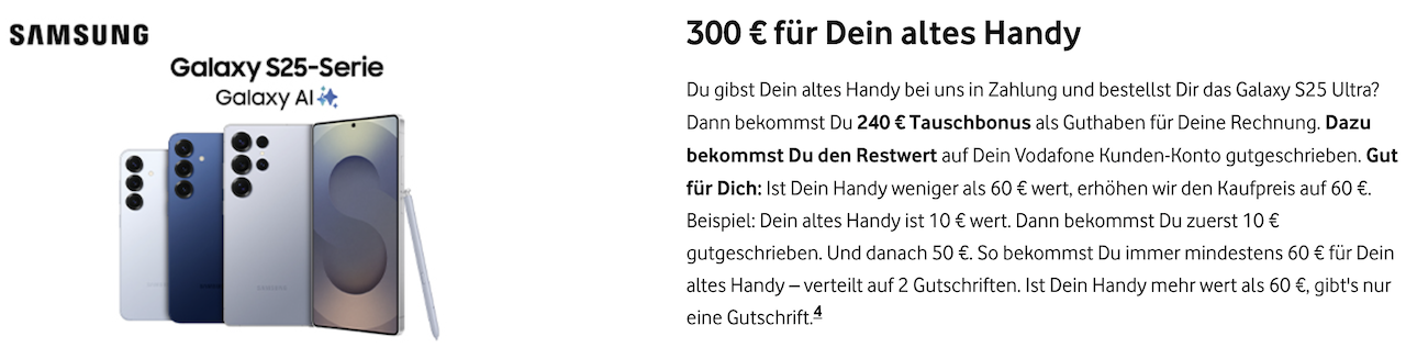 Gerade erst wurde die neue Samsung-Galaxy-S25-Reihe vorgestellt, schon gibt es auch Neuigkeiten zur aktuellen Trade-In-Aktion von Samsung. Direkt bei Samsung bekommst Du, je nach Altgerät, bis zu 850 Euro als Tauschprämie. Auch Vodafone ist mit von der Partie und bietet Dir bis zu 240 Euro Tauschbonus zuzüglich des Restwerts Deines Altgeräts. Die Trade-In-Aktionen laufen ab dem 22.01.2025 und endet zum 06.02.2025. Beachte unbedingt die Teilnahmebedingungen.[/banner_text] Bei einer (besonderen) Samsung-Tauschaktion, auch unter der Bezeichnung Samsung-Trade-In bekannt, geht es meist um Angebote, die sich um die Topmodelle der neuen Galaxy-Reihen drehen. In der Regel bekommst Du also dann eine hohe Samsung-Tauschprämie, wenn Du bei einem Premium-Gerät zuschlägst. Wieso eigentlich Tausch? Weil die Sache normalerweise innerhalb des Samsung-Trade-In-Angebots abgehandelt wird. Du tauschst also Dein altes Handy gegen die Neuheit ein. Meistens gibt es die Samsung-Tauschprämie direkt in der hauseigenen Samsung-Tarifwelt des südkoreanischen Herstellers. Die Aktion ist auch für das Galaxy S25 mit Vertrag, das S25 Ultra und das S25 Plus gestartet. Hier gibt es ein paar Besonderheiten: Grundsätzlich sind bis zu 850 Euro als Tauschprämie möglich. Genau genommen handelt es sich hierbei gar nicht um eine klassische Prämie, denn Du bekommst schlichtweg den Wert Deines Altgeräts gutgeschrieben. Dein altes Handy steht nicht in Samsungs Ankaufsliste? Dann wähle „Garantierter Trade-In, Alle Marken“ aus. Aber Achtung: Das funktioniert nicht, wenn Du das S25 mit Vertrag kaufen möchtest! Vodafone wirbt wie zuletzt auch wieder mit bis zu 240 Euro als Extra-Bonus für den Samsung-Tauschbonus. Der Anbieter unterscheidet hier, welches S25-Modell Du kaufst. Die Ultra-Version bringt Dir besagten 240-Euro-Bonus ein und obendrauf noch den Restwert Deines alten Handys (mindestens 60 Euro). Beim Basismodell sowie der Plus-Variante gibt es lediglich 120 Euro plus Restwert (mindestens 80 Euro). Den Bonus bekommst Du aufgeteilt auf 12 Monate gutgeschrieben (also jeweils 10 Euro). Meistens gibt es die Samsung-Tauschprämie direkt in der hauseigenen Samsung-Tarifwelt des südkoreanischen Herstellers. Die Aktion ist auch für das Galaxy Z Flip 6 mit Vertrag und das Galaxy Z Fold 6 mit Vertrag gestartet. Hier gibt es ein paar Besonderheiten: Grundsätzlich sind bis zu 250 € als Extra-Tauschprämie möglich. Fürs Altgerät gibt es, je nach Modell, bis zu 720 €. Dein altes Handy steht nicht in Samsungs Ankaufsliste? Dann wähle „Garantierter Trade-In, Alle Marken“ aus. Du bekommst 200 Euro, als Vorabzug gutgeschrieben. Falls Du gar kein altes Handy hast, kannst Du mit dem Code Z6SOFORT immerhin 100 € Sofortabzug mitnehmen. Laut Samsung läuft die Aktion bis 01.09.2024. Bei Sparhandy werden die 300 € als Direktabzug direkt von der Zuzahlung abgezogen. Die Aktion läuft, anders als bei Samsung direkt, bis 23.07.2024 als Vorbestellerangebot. Beachte unbedingt die Teilnahmebedingungen. Wie Sparhandy bestätigte, ist die Einsendung eines Altgeräts nicht erforderlich. In der MediaMarktSaturn Tarifwelt läuft der Trade-In bei Bestellung von Galaxy-Z-Geräten ebenfalls. Es gibt 100 € als Direktabzug bei Kauf eines Bundle mit Galaxy Z Flip 6 oder Fold 6. Beim Bundle mit Smartwatch werden sogar 150 € direkt abgezogen. Die Aktion läuft laut Aktionsinfos bis 30.09.2024. Beachte, dass die Einsendung eines Altgeräts hier zwingend notwendig ist. Vodafone wirbt wie zuletzt auch wieder mit 240 € als Extra-Bonus für die Samsung-Eintauschaktion. Insgesamt wird ein Bonus von 500 € ausgewiesen, der sich aus 240 € Extraprämie sowie mindestens 260 € für das alte Smartphone zusammensetzt. Selbst, wenn Dein Handy deutlich weniger als die ausgerufenen 260 € wert ist, schreibt Dir Vodafone den entsprechenden Betrag gut. Beachte: Die 240 € Extraprämie findest Du auf Deiner Handyrechnung, die mindestens 260 € Gerätewert werden Deinem Kundenkonto gutgeschrieben. Bei sparhandy und auch direkt bei Samsung gibt es zum Release des Galaxy A55 und des A35 wieder eine Tauschprämie als Trade-In-Bonus. Bis zu 300 € sind dann extra möglich. Bei Vodafone gibt es einen Extra-Bonus in Höhe von 120 € bzw. 240 €, wenn Du Dein Altgerät einsendest. Die Auszahlung setzt sich wie folgt zusammen: Für das Galaxy S24 und S24 Plus: Für das Galaxy S24 Ultra: Auch Sparhandy und Deinhandy nehmen an der Galaxy S24 Trade-In-Aktion teil. Das Angebot mit dem erhöhten Trade-In-Bonus wurde jedoch bereits beendet. Für das Galaxy S24 und das S24 Plus gibt es jetzt 100 € als Trade-In-Prämie, für das Galaxy S24 Ultra sind es 150 € Tauschbonus. Auch Sparhandy und Deinhandy haben ursprünglich an der Galaxy S24 Trade-In-Aktion teilgenommen. Das Angebot mit dem erhöhten Trade-In-Bonus wurde jedoch bereits beendet. Für das Galaxy S24 und das S24 Plus gab es 200 € als Trade-In-Prämie, für das Galaxy S24 Ultra waren es 250 € Tauschbonus. Du bekommst die Tauschprämie bei Vorbestellung des Galaxy S23 (Plus, Ultra) in einem Media Markt oder Saturn vor Ort oder online und gleichzeitiger Nutzung des Ankaufservice (Einsendung eines alten Smartphones). Du erhältst mindestens 120 € Cashback bei erfolgreicher Teilnahme. Teilnahmezeitraum: 01.02. bis 16.02.2023. Beachte die Teilnahmebedingungen für alle teilnehmenden Geräte. Das alte Smartphone muss sich u.a. einschalten lassen. Bei Onlinekauf ist die Teilnahme samt Registrierung über den Partner bis 19.03.2023 möglich, die Einsendung des alten Smartphones muss bis 31.03.2023 erfolgen. Die 120 € inkl. der Tauschwert werden nach Prüfung auf Dein Bankkonto überwiesen. Auch sparhandy nimmt an der Galaxy S23 Trade-In-Aktion teil. Der Tauschbonus ist je nach Modell gestaffelt. Für das Galaxy S23 und das S23 Plus bekommst Du 100 € als Trade-In-Prämie. Und kaufst Du das Galaxy S23 Ultra, gibt es 150 € als Tauschbonus für Dich. Achte unbedingt darauf, dass es sich