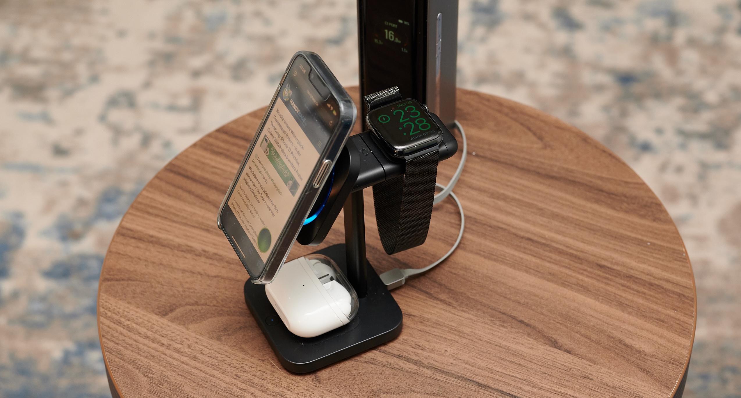 Das auffallende Äußere macht sich jedenfalls sehr gut als Design-Stück auf dem Nachttisch. Mit der Wireless-Charging-Station kannst Du ein Smartphone per Qi2 laden, eine Apple Watch und ein Kopfhörer-Case per Qi. Mit letzterem lässt sich auch ein zweites Smartphone laden. Das Google Pixel 9a passte knapp noch auf die Ladeschale, verdeckte dann aber das Display.