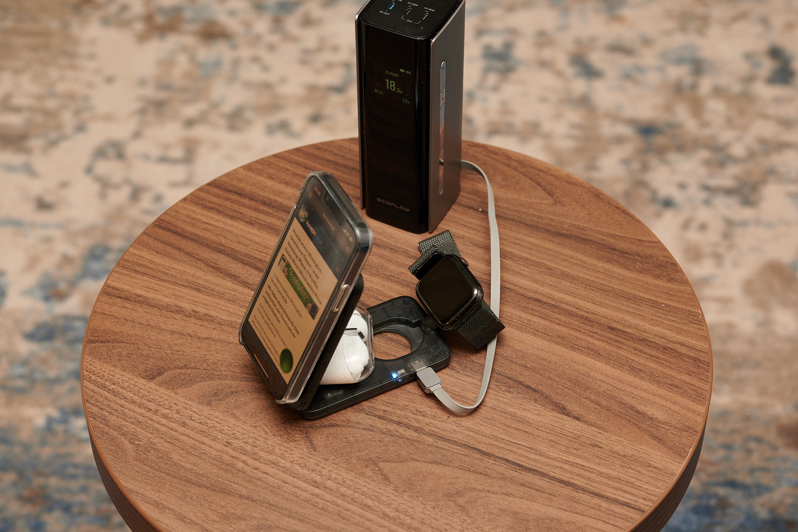 ESRs Qi2-25W-Tischlader arbeitet mit großen Abständen. Der Ladepuck für die Apple Watch kann abgenommen werden. (Foto: Andreas Sebayang / Handyhase)