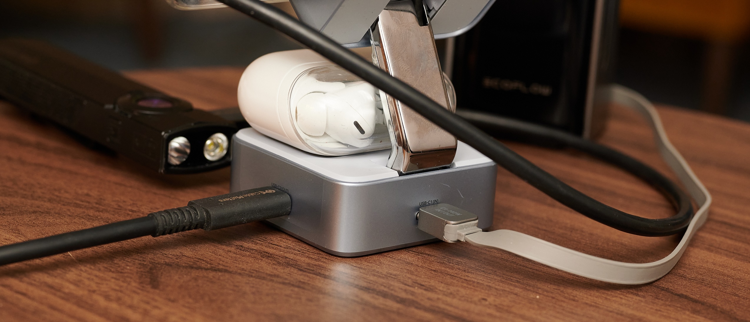 Außerdem gibt es ein Qi-Ladepad unten, das mit einem Smartphone aber nur sehr mühsam nutzbar ist. Das liegt auch an der herausklappbaren Ladefläche für eine Apple Watch. Ladecases für Ohrstöpsel sind aber kein Problem. Das Ganze kommt in einem leicht transparenten Gehäuse. Wer Tech-Design mag, wird hier Gefallen daran finden.