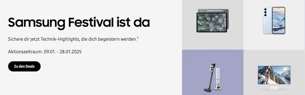 Bis zum 28.01.2025 hast Du die Chance, Dich mit den besten Samsung-Highlights zu verwöhnen. Stell Dir vor, Du könntest das Galaxy S24 zu einem unschlagbaren Preis in den Händen halten, auf dem Galaxy Tab S10 Ultra in hervorragender Qualität streamen, Dein Wohnzimmer mit einem der ausgewählten Samsung-TV-Geräte in ein Kinoerlebnis verwandeln oder Dein Zuhause mit modernsten Samsung-Hausgeräten aufwerten.