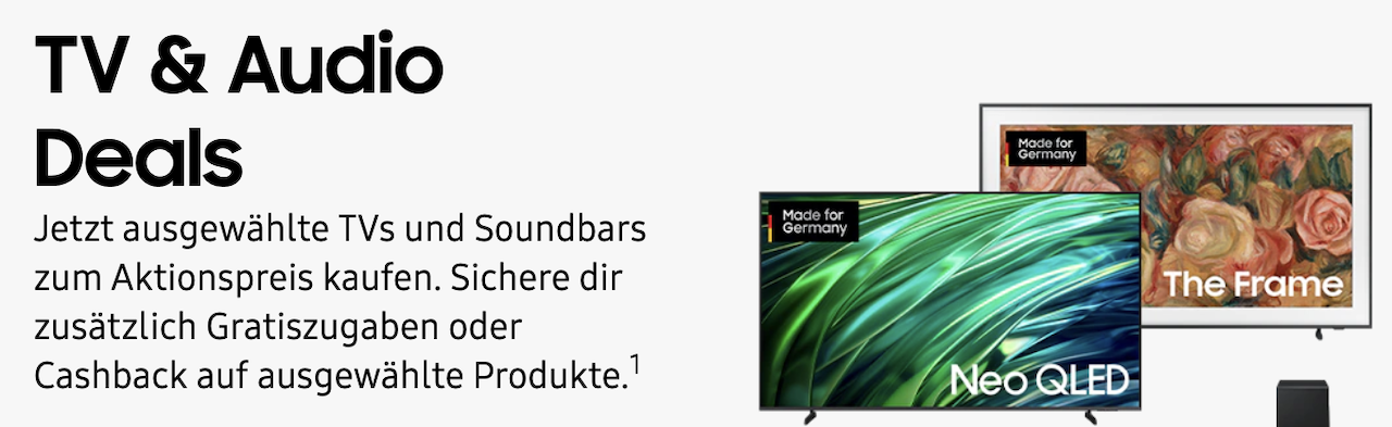 • Profitiere jetzt von Aktionspreisen auf ausgewählte Samsung TV-Geräte und sichere Dir attraktive Gratiszugaben! Wie wäre es mit dem 50″ QLED 4K The Frame LS03D Smart TV (2024)? Den bekommst Du bereits ab 1.265 Euro und wählst zusätzlich zwischen einer gratis Ultra Slim Soundbar HW-S710GD 3.1-Kanal & Subwoofer (2024) oder einem2 Music Frame HW-LS60D/ZG. Obendrauf gibt es noch 10 Prozent Sofortabzug im Warenkorb.