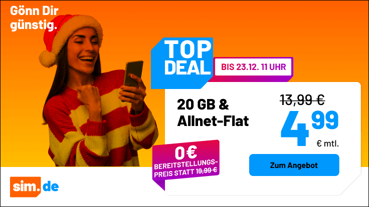 sim.de mit starken Angeboten – z. B. 20 GB für nur 4,99 € monatlich oder 50 GB für nur 8,99 € monatlich!