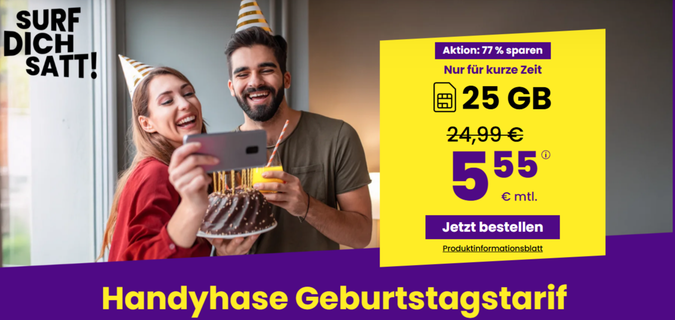 🥳 Kracher zum Handyhase-Geburtstag! 25 GB Datenvolumen für nur 5,55 € im Monat