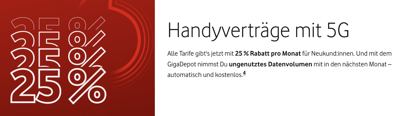 Bei Vodafone gibt es außerdem aktuell 25 % Rabatt auf alle GigaMobil-Tarife! So bekommst Du beispielsweise den GigaMobil M mit 100 GB Datenvolumen für 37,49 € im Monat. Zusätzlich entfällt die Anschlussgebühr bei allen GigaMobil-Tarifen. Besser geht es fast schon nicht mehr! Der Rabatt ist bis zum 10.11.2025 und nur für Neukunden gültig.